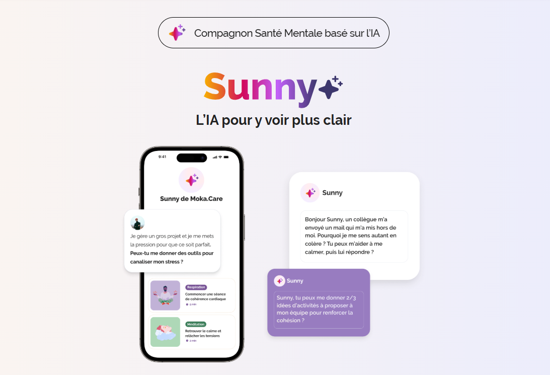 Depuis la plateforme de Moka.care, les équipes d’une entreprise peuvent accéder à des ressources variées : modules d’auto-évaluation, parcours pédagogiques, boîte à outils. La nouveauté de cette plateforme ? Sunny, un chatbot intégré, qui répond aux questions des utilisateurs grâce à de l’IA générative.